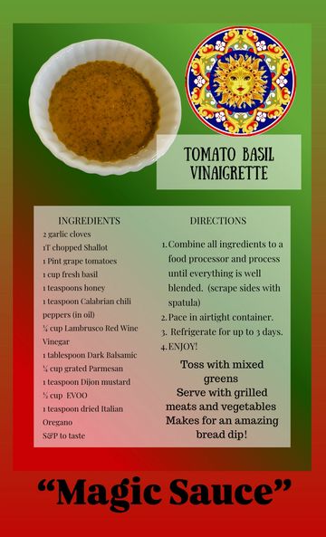 Fresh, bright and delicious! Drizzle me on salads, sandwiches, salmon, grilled chicken and veggies, and sliced tomatoes.