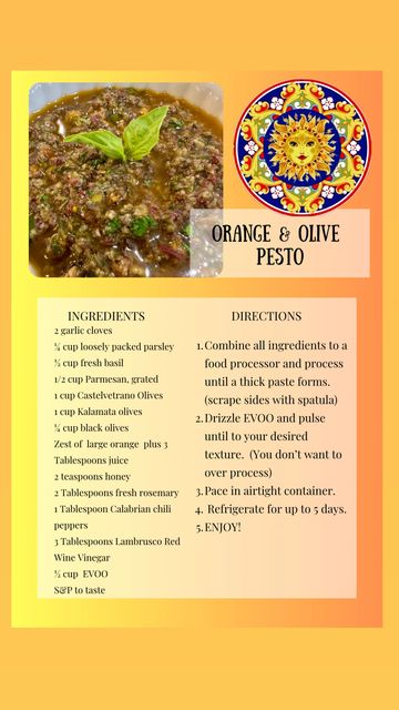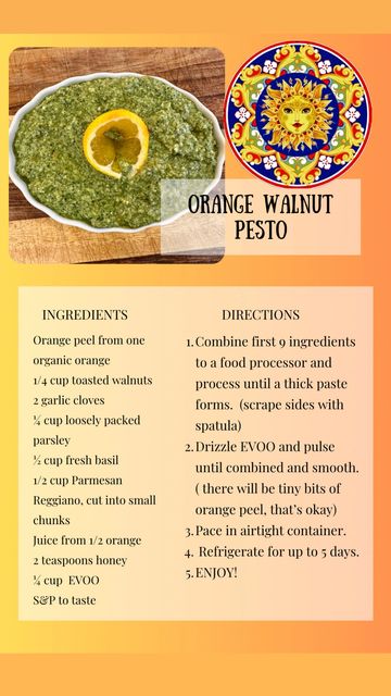 This magical pesto celebrates the flavors of Sicily. Bright flavors of orange, crisp freshness of parsley and kale, with a hint of sweetness from the honey. Delicious tossed with pasta, smear on crunchy bread, or top on fish, salmon, and chicken.